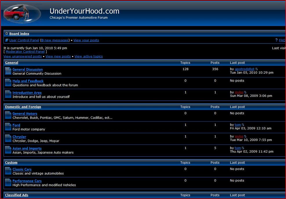 The Under your hood Website is Chicago's Premier Automotive Forum. This was an idea for a domain name that I have had for quite some time and finally It became a reality, Although the furture of this website is unclear, it is an example of another open source board known as Word Press. This domain name www.underyourhood.com is 4 sale. Please Contact Us for more information.