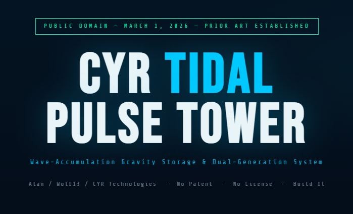 by mykeGlobal Cooling, it's an important and hot topic. Clean energy and climate change go hand in hand. The CYR Tidal Tower takes a fraction of a wave's kinetic energy. The wave still arrives. The water returns to the ocean at ocean temperature. The land footprint is 100 square meters. No heat is generated. No patterns are changed. No toxics are produced beyond standard construction materials. Teardown takes weeks. The site is returned clean.