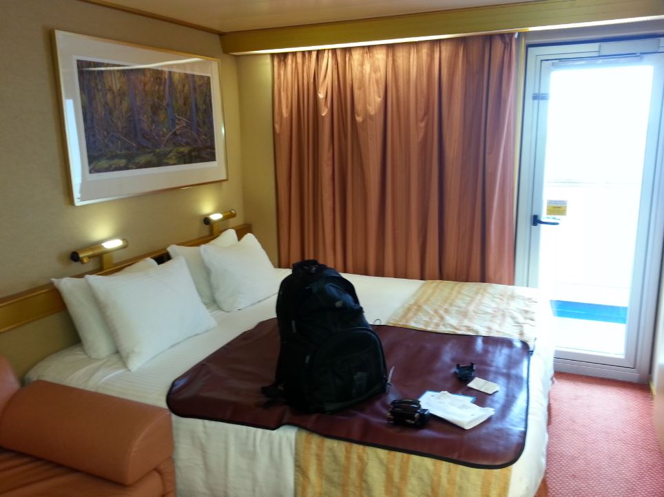 The room is nice it's almost as big as the hotel room at the Holiday Inn Express we stayed at in Miami the first night. Its nice to have the queen size bed. On our last cruise there was 2 single size beds we pushed together to make one, then you kept slipping between them if you tried any "together" in the middle snuggle time. It's comfortable and I have slept great so far. Our son and daughters room is directly across the hallway from us and our room has a nice balcony, our room number is 7-357 My sister in law's room is a little bigger with a balcony that is twice the size of ours. I didn't know there was such a "variance" between rooms. I'll have to do a little more research if we ever get to go on that Hawaii vacation. One of the people I went on the ship tour with (more about that later) claimed he had the presidential suite and that it was the largest room on the ship. Not sure how many of these rooms Victory has?