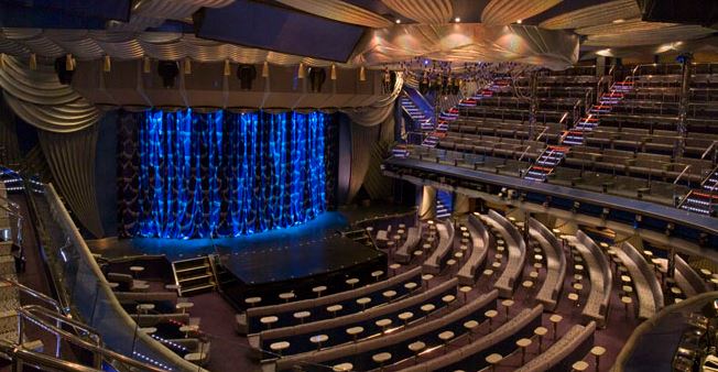 The entertainment director talked about how the counter and balance weights for the various stage effects needed to be on guides because of the ships rocking and movements. To raise and lower the different stage props for the shows. They have many techs involved for the theater shows who handle the sound and lighting effects. There is also a special bomb proof locker to keep the explosives for use in pyrotechnics displays. Only 2 people on board have a key. I saw the dressing rooms back stage with all the costumes, wigs and hats. The costumes were new in 2008 and will need to last awhile longer. One of the dancers is also a seamstress and the costumes need to be constantly maintained so that they will last as long as possible.
