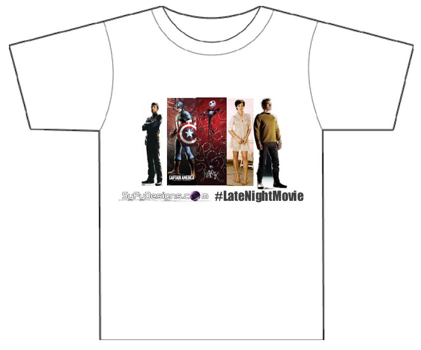 I am visualizing the top 5 all tight together in a block printed on a shirt, with syfydesigns.com and #LateNightMovie on it, maybe a small #FridayNightFix on the corner in a balloon or something.