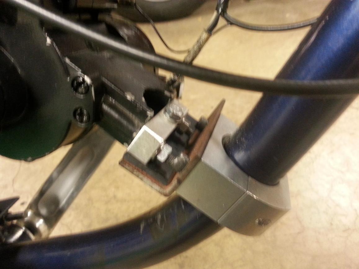 Front mount I used from the original kit, this mount seems good and I used a small piece of rubber, to act as a vibration dampener we will see with time how well this works. The last time I road this bicycle with the gas engine there was a lot of vibration in the handlebars and seat as well as the pedals. I predict that with the addition of jack shaft I will be able to pick a different gear and operate the engine at RPM's that don't vibrate as badly